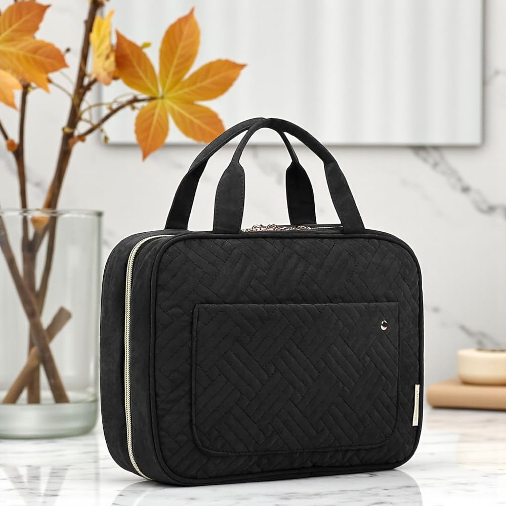 This is a must-have for keeping the hotel room tidy. A hanging toiletry bag unfolds to display all its contents, preventing counter clutter and ensuring nothing gets left behind.
