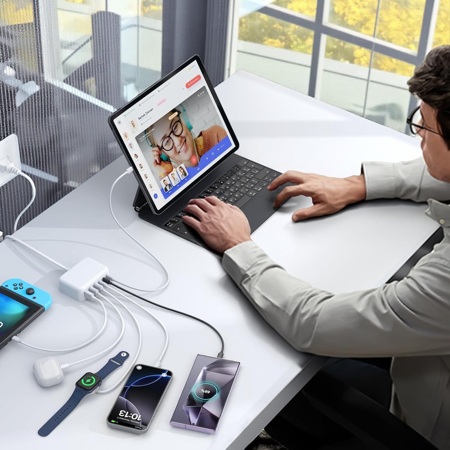 Hotel rooms and airport lounges often have limited outlets. A multi-port travel charger with both USB-A ports and a built-in USB-C port allows you to charge multiple devices at once from a single outlet.