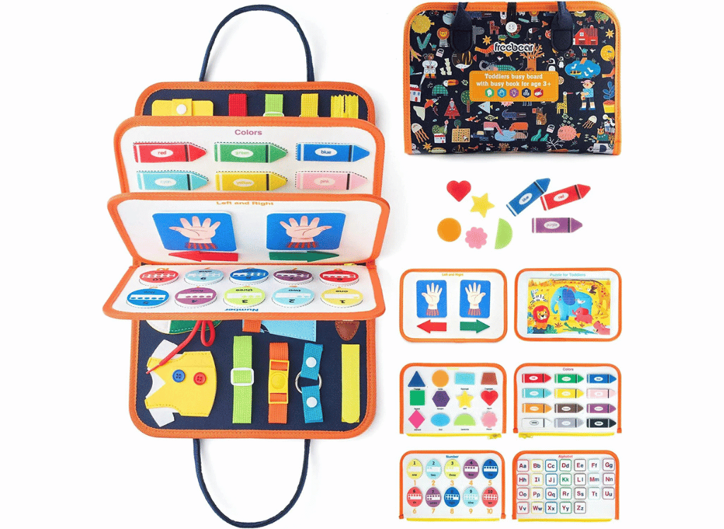 The Freebear Sensory Busy Activities Board is an innovative educational toy that helps children develop basic skills such as tying shoelaces, zipping up jackets, buckling belts and buttons, and snapping. It also encourages learning of shapes, colors, numbers and the alphabet.