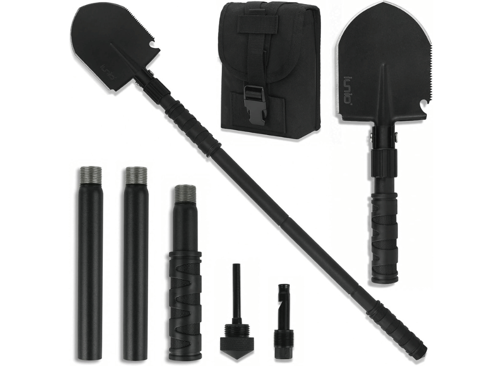 The iunio 31in Folding Camping Shovel is a traveller’s delight, designed with inputs from seasoned outdoor enthusiasts. Ideal for a wide range of activities like RV camping, hiking, gardening, and off-roading, this folding shovel boasts an extraordinary set of features: shovel board, saw, bottle opener, emergency whistle, fire bar, hammer, nail extractor, hoe, and fish scaler tool. What truly sets it apart is its extension bars, allowing you to customize the shovel's length for comfortable, upright digging. Made from high-carbon steel with a rubber grip, this sturdy and durable shovel folds up compactly to fit in a tactical waist pack, ensuring it’s always ready for your next adventure.