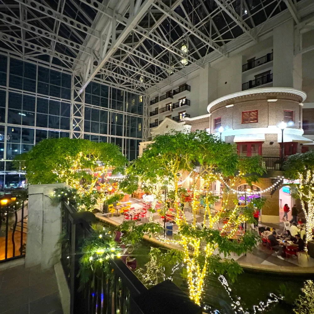 The moment guests step into the atrium, the transformation is instant. The entire space glows with lights, garlands, and holiday scenery that brings enchantment to every direction. The Gaylord Texan Christmas décor blends Texas charm with whimsical holiday magic — massive ornaments, sparkling trees, and a Christmas village atmosphere you can feel the moment you enter.