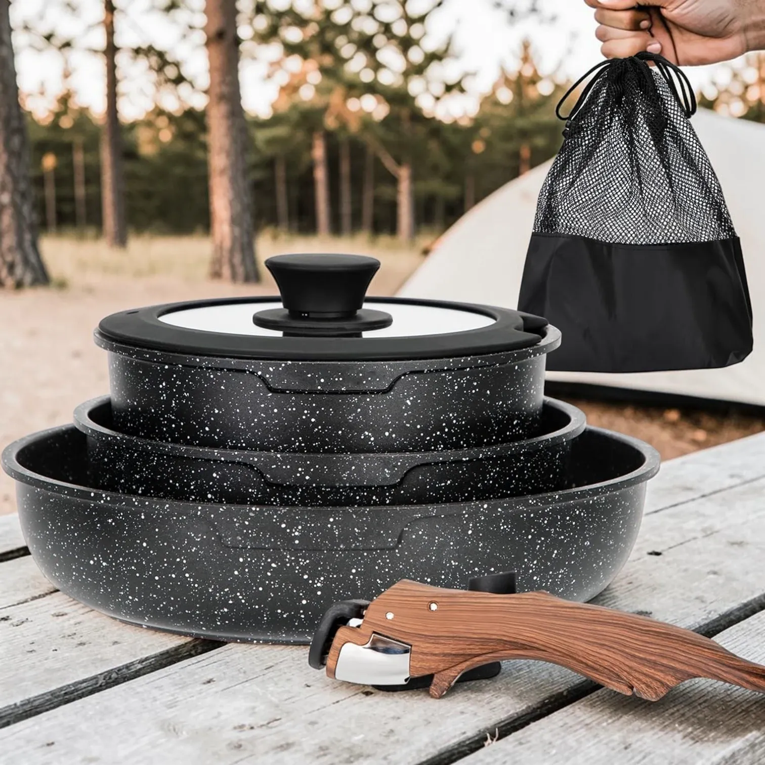 If he enjoys camp cooking, a stackable nonstick cookware set is a smart upgrade. This type of set is convenient, compact, and ideal for car camping or RV setups when easy storage and easy packing start to matter. A cookware set with a detachable handle, storage bag, and nonstick surface can be a great idea for someone building a more efficient setup.