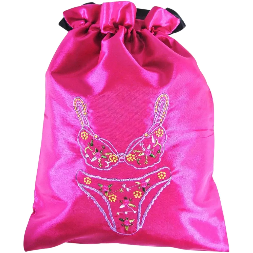 This magenta silk lingerie bag is both stylish and functional, making it a standout option for travelers who want something beautiful yet practical. The embroidered bra-and-panty design adds personality, while the drawstring closure keeps lingerie secure.