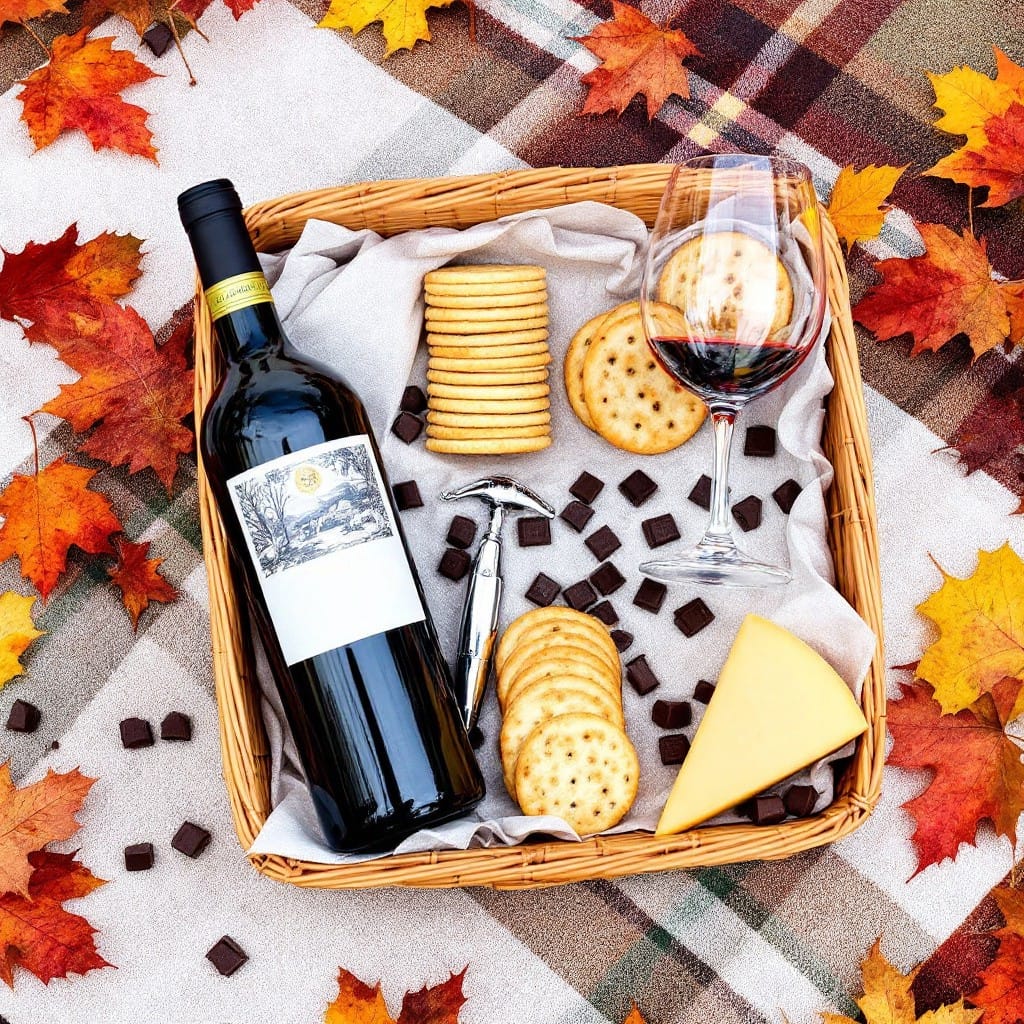 What's Inside: This elegant basket is perfect for a special occasion. It features a bottle of red or white wine chosen to pair with fall flavors, two durable, travel-friendly wine glasses, and a corkscrew. The basket is adorned with gourmet crackers, a wedge of sharp white cheddar, and some sweet, dark chocolate to complete the tasting experience.