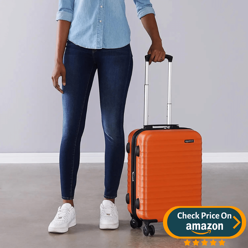 The Amazon Basics 21-Inch Hardside Spinner is a lightweight, durable, and affordable carry-on luggage option, competitively priced compared to other carry ons. Its protective ABS hard shell is scratch-resistant, ensuring long-term durability, while its four double-spinner wheels provide smooth maneuverability.
