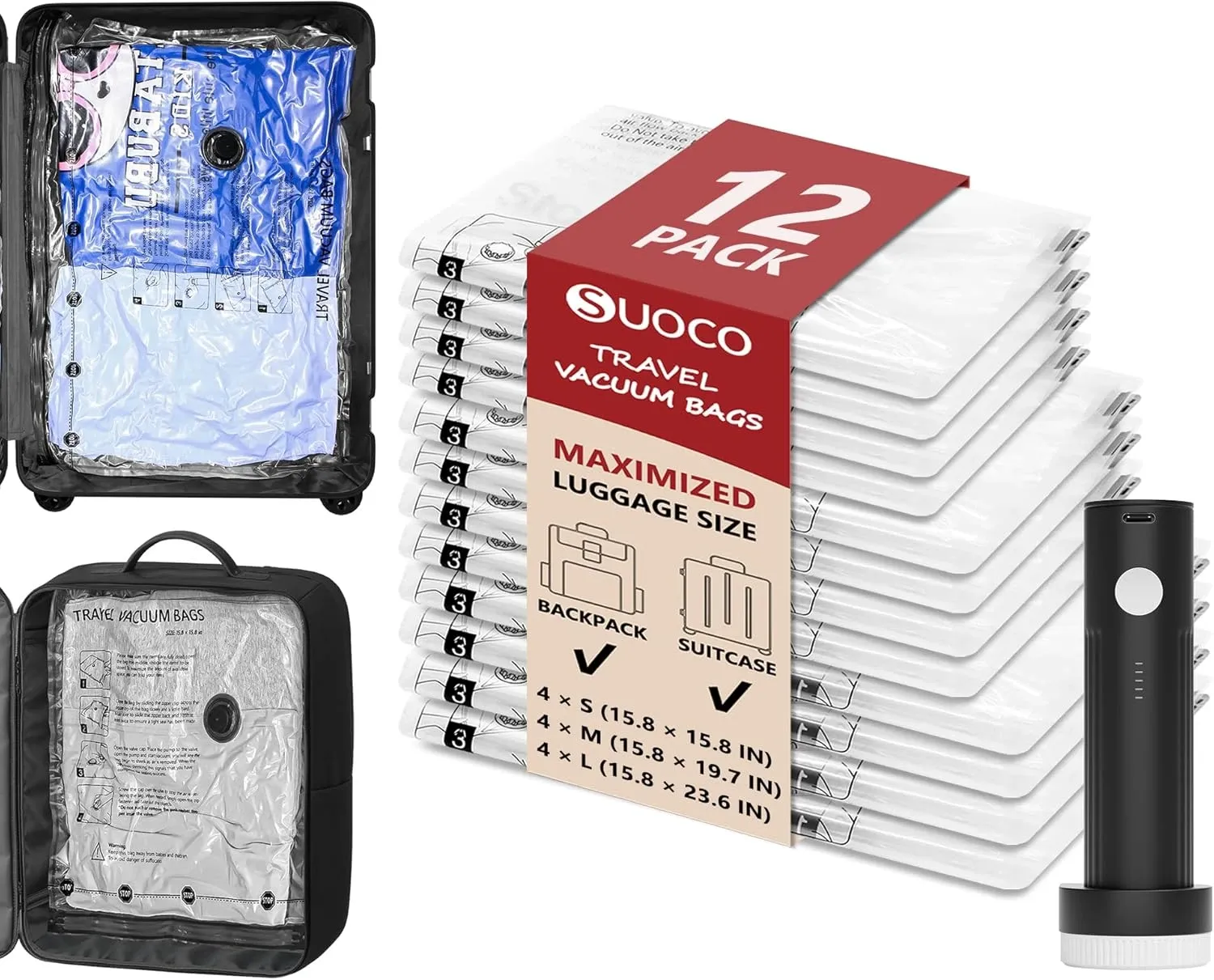 5. SUOCO Travel Vacuum Bags for Luggage & Backpack (12-Pack + Pump)